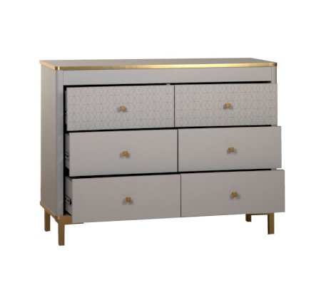 Корпус и фасады комода изготавливается в ЛДСП цвета Серый. Кромка, ручки и опоры золотого цвета. В сочетании с золотом серые тона выглядят не скучно, а золото приобретает благородный оттенок, что в итоге дает изысканное и утонченное сочетание.