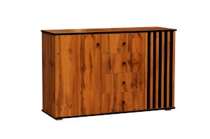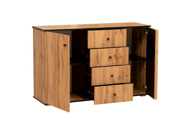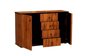По краям – справа и слева – за распашными дверцами находятся полки, а в середине – четыре выдвижных ящика. Однако в середине – это не значит, что в центре. Принцип асимметрии здесь ярко выражен. Левая часть комода самая широкая, правая – гораздо уже. А пространство между ними отдано под выдвижные ящики. Таким образом, самая вместительная часть комода находится слева, за однотонной распашной дверцей цвета дуба Вотан. Внутри – два отделения – больших и вместительных, сюда поместятся объемные вещи. Каждая полка из ЛДСП выдерживает до 5 кг. В правой стороне места чуть поменьше – за счет ширины полок, но вполне достаточно, чтобы разместить, например, коробки с обувью или сложить вещи или постельное белье. Выдвижные ящики предназначены для хранения менее габаритных вещей. В зависимости от тематики помещения в них можно разложить бумаги, документы, нижнее белье, полотенца. На верх комода можно поставить телевизор, а если повесить над ним зеркало и на столешнице расставить духи и косметику, он превратится в туалетный столик!