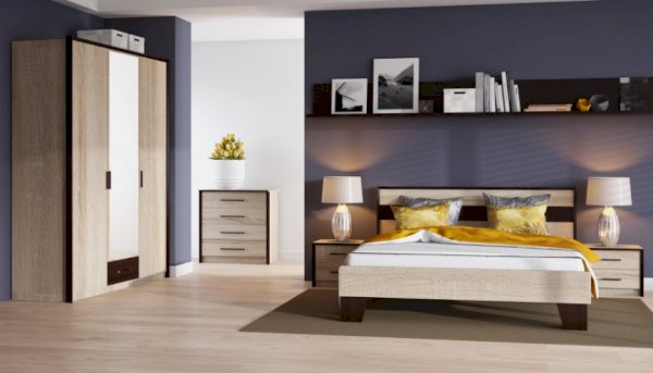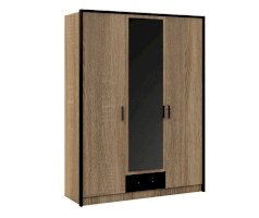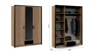 Классический распашной трехдверный шкаф с дополнительным выдвижным ящиком выполнен в стиле минимализм: строгие черты, функциональность и простота. Контрастный профиль из МДФ 22мм по внешним углам со скругленными краями – максимально безопасное использование мебели. Кромка цвета венге подчеркивает древесную текстуру и рисунок светлого дуба сонома. Зеркало на центральном фасаде делает комнату светлее и просторнее. Мебель выполнена из экологичных материалов