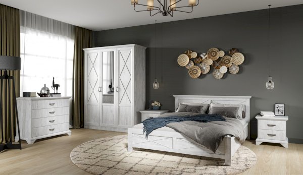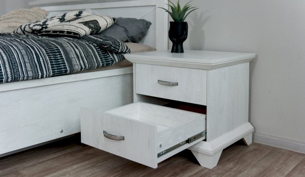 Тумба с фасадами цвета «Бетон пайн» с фактурой и рисунком натурального дерева добавят помещению света и сделают ее воздушней. Металлические ручки цвета состаренного серебра придают изысканность, а фигурные ножки и декоративный профиль крышки подчеркивают стилистику коллекции. Ящики на телескопических направляющих поместят в себя все необходимые предметы, которые важно иметь под рукой - телефон, очки, светильник или любимая книга. Мебель выполнена из экологичных материалов.