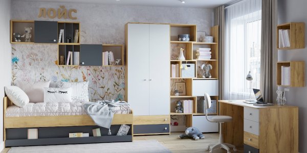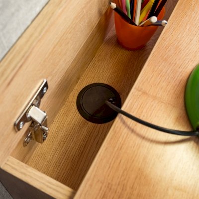 Стол письменный отличается нестандартным решением для столешницы, которая максимально адаптирована для потребностей современных детей и работе на компьютере. Под откидной её частью, которая открывается за плавный вырез, прячется ниша для хранения и отверстие с заглушкой для вывода проводов, чтобы они не запутывались и не мешали ребенку. Если ребенок ещё не занимается за компьютером, то нишу можно использовать и для размещения органайзеров с карандашами, фломастерами и красками, чтобы они не отвлекали от творчества. Дополняют стол ящики на шариковых направляющих. За счет просторной рабочей поверхности, а также возможности левосторонней и правосторонней сборки письменный стол одинаково удобен как для левши, так и для правши.