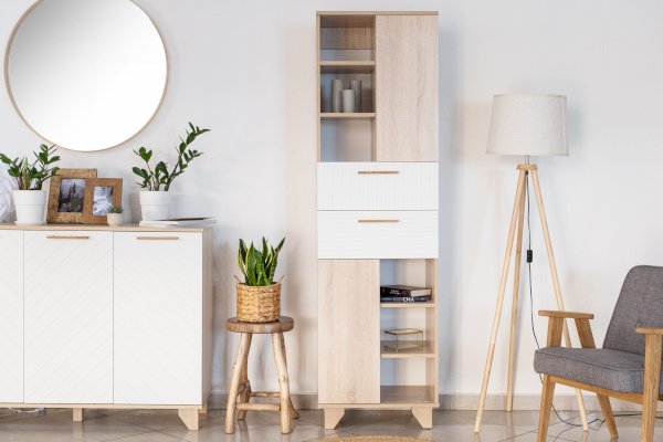 Шкаф-пенал — это отличный функциональный элемент для гостиной. Пенал оснащен открытыми полками и полками со створками, что позволяет хранить и предметы декора, и личные вещи, документы.