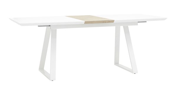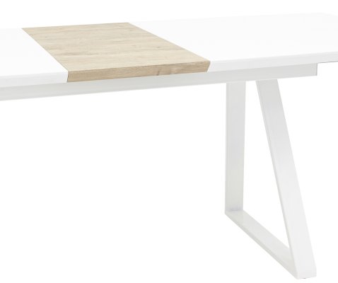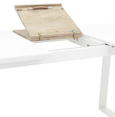 Обеденный стол раскладной. Столешница выполнена из прочного и долговечного МДФ. Простая прямоугольная форма стола позволит легко вписать его в современный интерьер, стол украсит кухню, гостиную или современное кафе, ресторан. Дополнительная вкладка стола выполнена из МДФ с бумажным шпоном цвета беленого дуба. На вкладке предусмотрена петля для комфортного открытия стола одной рукой.