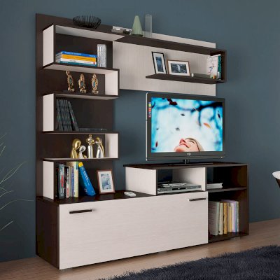Функциональный и компактный гарнитур Евро прекрасно подойдёт для небольшой гостиной. Модель, ориентированная на удобство и простоту использования. Оригинальные открытые полки, на которых можно разместить фотографии, предметы декора или любимые книги, представляют собой единую ломаную линию удобная зона под ТВ вместительная ниша, скрытая створкой.