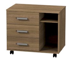 Тумба с хорошей вместимостью, имеет три выдвижных ящика полного выдвижения, открытые полки. Колесные опоры придают модулю необходимую мобильность.