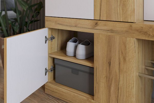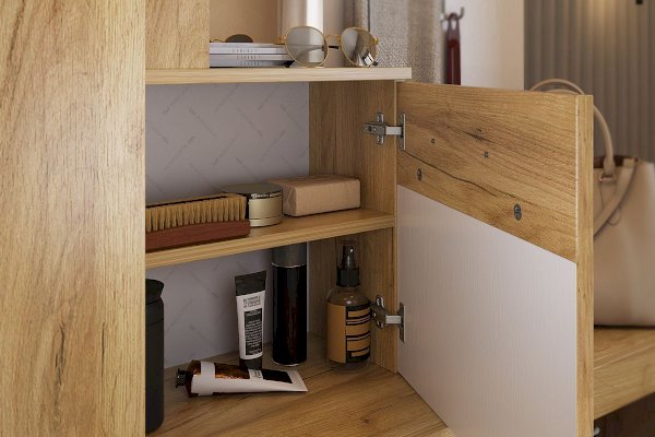 «Алекс» - прихожая 3 в 1. Это открытые ниши для размещения одежды, сумок на металлические крючки и модное решение из хромированных трубок для хранения повседневной обуви.  Закрытый шкаф-гардероб для несезонной обуви и верхней одежды на плечиках. А так же ниша-трюмо с зеркалом и полками сбоку станут незаменимыми помощниками в наведении  утреннего марафета. В закрытом шкафу под зеркалом можно хранить средства для чистки обуви, фен и другие нужные вещи. Прихожая «Алекс» - в ней поместится ВСЕ и даже Больше!