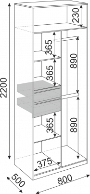 • В левой секции нижняя и верхняя узкая полка на 375 мм - съемные.