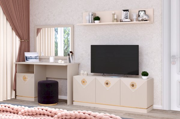 Купить письменный стол в гостиную или спальню - отличное решение.  Модуль очень функционален благодаря своей продуманной конструкции. Здесь вам доступны тумба с дверкой и ниша для открытого хранения всевозможных письменных принадлежностей, книг и журналов. Дизайн и наполнение стола позволят использовать его и как туалетный столик в спальне, в таком случае к нему прекрасной подойдёт зеркало Капри.