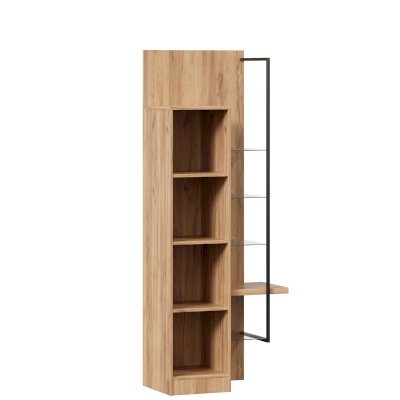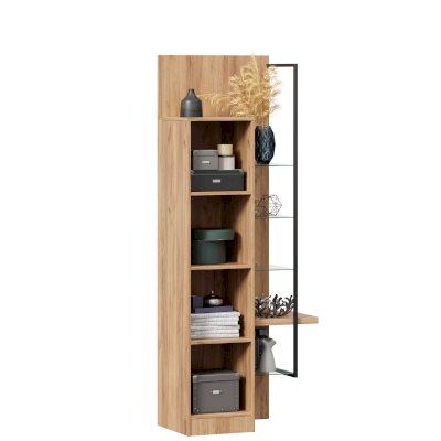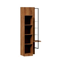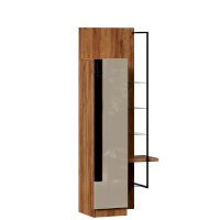 • Шкаф правый визуально разделен на две части – непосредственно шкаф (350х1500х391 мм) с 3 полками ЛДСП за распашной дверью (открывается всегда направо) и секцию с открытыми полками: 4 стеклополки (223х330 мм) и 1 полка из ЛДСП 32 мм (350х334 мм) – и декоративным металлическим кронштейном.