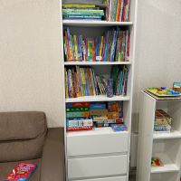 лаконичный, белый, с ящиками, высокий и глубокий, удобен для хранения и расстановки книг плюс хранение других вещей в комнате. прост в сборке - собирается за час максимум