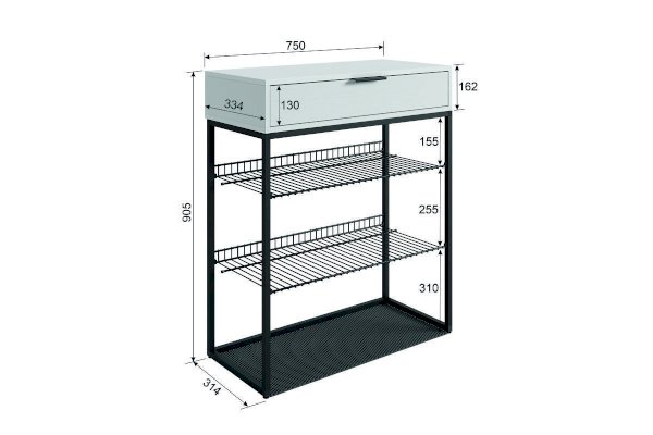 Модная консоль для обуви в стиле Лофт из алюминевого профиля, легкая. На 2-е съемные полки для обуви и эва коврик входит 12 пар обуви. Сотовые полки расположены горизонтально, благодаря этому можно разместить на полках обувь и любые коробки для хранения функциональных мелочей. Задний бортик сотовых полок защитит стену от загрязнений. Обувница компактная и функциональная, поместится в любой прихожей, а разместив над обувницей зеркало, ее можно использовать как трюмо. В выдвижном ящике на шариковых направляющих поместятся много полезных мелочей: фен, расчески, средства для чистки обуви и другие предметы. Ящик открывается с помощью стильной металлической ручки-профиля. Регулируемые опоры позволят скомпенсировать неровности пола. Эва коврик входит в комплект обувницы, убережет ваш пол от загрязнений и позволит подошве оставаться всегда сухой. Изделие не разборное, сборка алюминевой конструкции одноразовая.