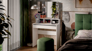 Туалетный стол «Софт» в белом цвете идеально подойдет как для светлого помещения, так и для интерьеров в темных тонах. Черные вставки на задней стенке под зеркалом и над выдвижным ящиком создают современный и стильный дизайн, который подходит для любых интерьеров. Черные элементы дизайна являются лаконичными акцентами, которые придают туалетному столу утонченность и изысканность.