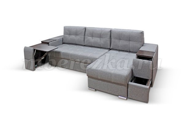 Угловой диван со столиком и выдвижными ящиками в подлокотниках «РИФ» завоевал среди покупателей большую популярность. Такая мебель значительно экономит пространство в помещении и, несомненно, делает отдых на диване комфортнее, ведь буквально под рукой есть раскладной столик в подлокотнике, на который можно поставить бокал, положить книгу или журнал, удобен при работе с ноутбуком. Другой подлокотник оборудован выдвижными полочками для хранения различных вещей. Большой ящик для белья внутри дивана, простой, и надежный механизм трансформации «тик-так» подтверждают функциональность этой модели. Блок независимых пружин, прошивка на сиденье – гарантия длительной эксплуатации дивана.