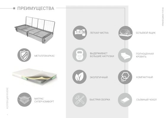 • прочный, надежный механизм для интенсивной эксплуатации. Распределенная нагрузка на спальное место 300 кг