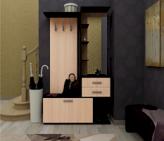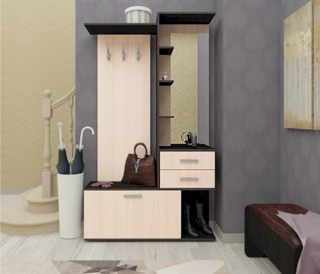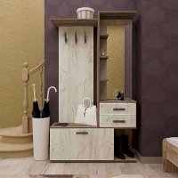 Состоит из полки с крючками, тумбы.