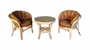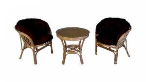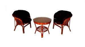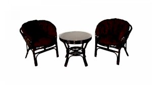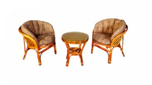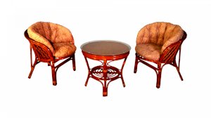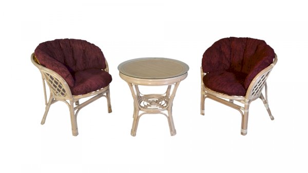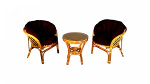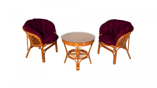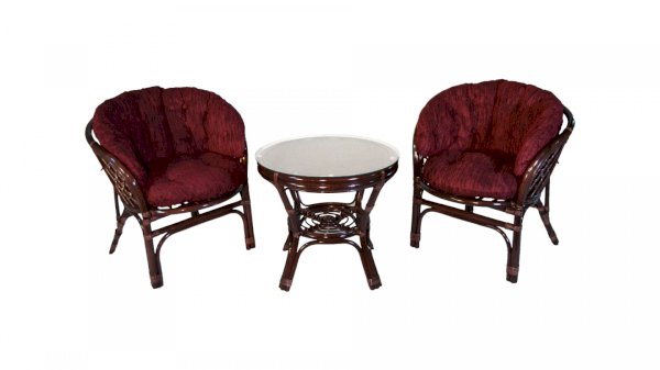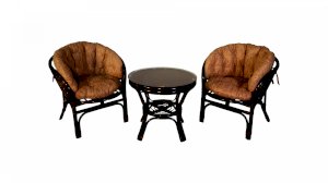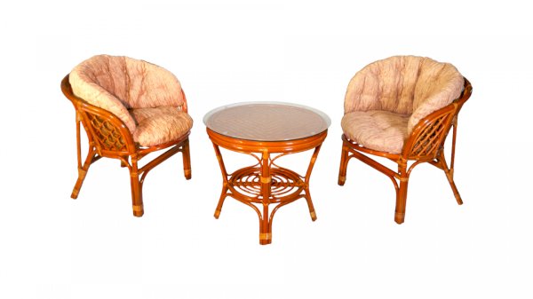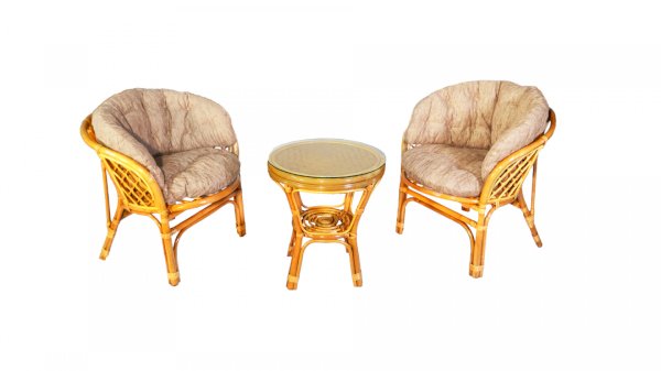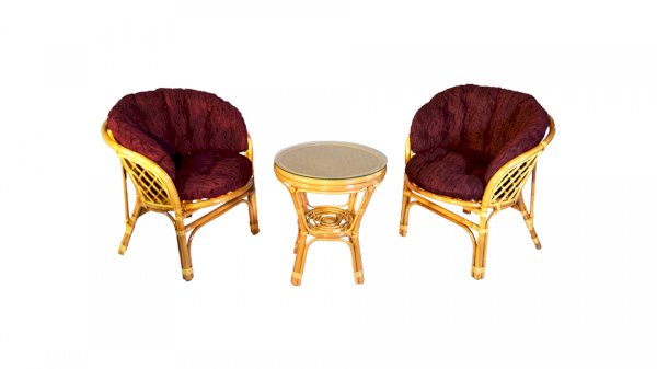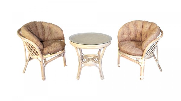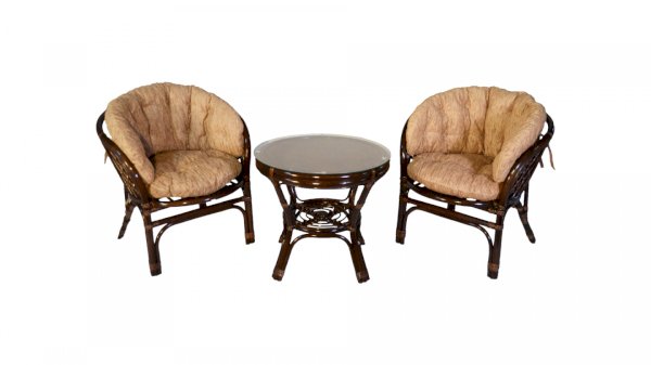 Комплект из натурального ротанга, состоящий из двух кресел и круглого столика с плетеной столешницей. Стекло входит в комплект.