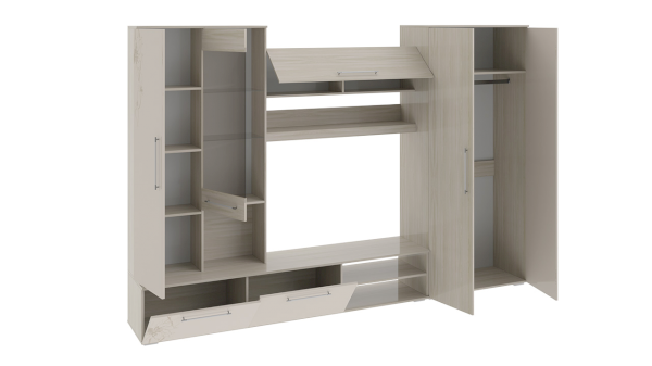 Изделие имеет максимально продуманную конструкцию – шкаф с полками, шкаф с штангой для одежды, открытые и закрытые секции позволят хранить медийную технику и личные вещи. Откидные фасады оборудованы газлифтами, что добавит в эксплуатацию мебели еще больший комфорт, а открывание сделает плавным и бесшумным.