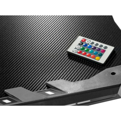 Дизайн стола достаточно простой, но современный — столешница с декоративным покрытием «под карбон» на двух устойчивых ножках в универсальном черном цвете. По боковым кромкам встроена яркая LED-подсветка, которую можно легко регулировать пультом дистанционного управления.