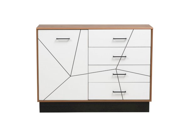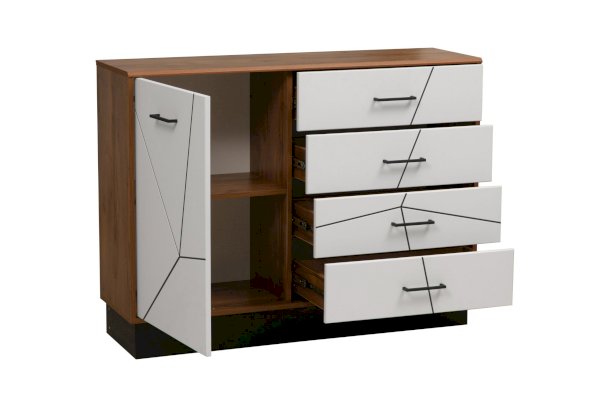 Данный модуль разделен на две части, у каждой из которых свой функционал. Справа расположены четыре выдвижных ящика – один под другим. Слева – за распашной дверцей – полки. Целых четыре ящика позволяют разместить абсолютно разные сегменты вещей. Это могут быть и документы, и сложенные вещи, и постельные принадлежности, а нижний ящик подойдет для обуви. Если поставить комод в прихожей и сверху повесить полку 54.09, получится отличная прихожая – по ширине эти два модуля совпадают и визуально будут смотреться комплектом.  Ящики снабжены шариковыми направляющими, которые обеспечивают плавный ход выдвижения.