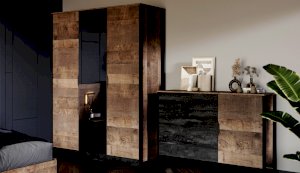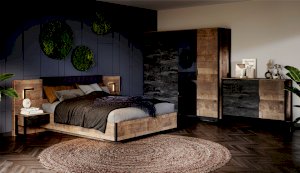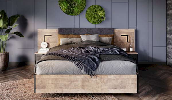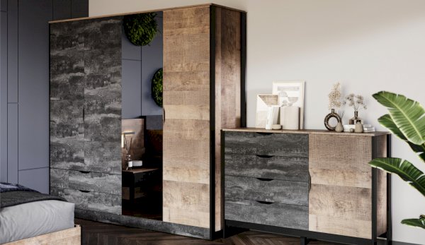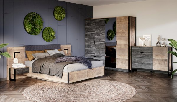 Спальня «Стокгольм» – это современная функциональная система, которая станет главным украшением лофтового интерьера. Особенность дизайна – это сочетание реалистичных по цвету и тактильности трендовых декоров, которые соответствуют последним городским тенденциям. «Дуб Гранж» привлекает имитацией вручную обработанного дерева с выразительной зернистой текстурой, характерной формой досок. Стильный серый цвет «Железного камня» с металлическими разводами и новая текстура состаренной штукатурки в сочетании с гладкостью металла вносят индустриальныи? колорит. Оригинальные ножки-опоры из контрастного профиля МДФ, расположенные по бокам модулей, имитируют металл и подчеркивают стиль коллекции. Кровать выполнена в простых и лаконичных формах, мягкая накладка с вертикальной прострочкой комфортно поддерживает спину во время отдыха. Скрытые опоры основания придают эффект парения, создают завораживающий футуристический интерьер.