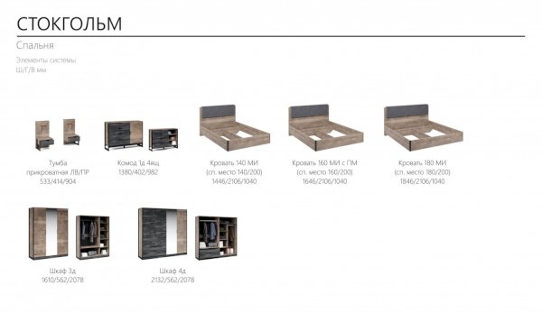 Модульная спальня Стокгольм Дуб гранж песочный/Железный камень (Империал)