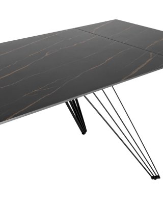 Стильный в сдержанным образе раскладной стол станет прекрасным дополнением для кухни и обеденной зоны. Столешница из темной керамики устойчива к повреждениям и истиранию, долговечный материал с прочной текстурой. По бокам стола расположены дополнительные раздвижные элементы, которые увеличивают полезную площадь столешницы. Металлический каркас лаконично вписывается в образ за счет оригинальных ножек из нескольких линий. Основание оснащено заглушками, которые не позволяют металлическим частям соприкасаться с полом и портить покрытие при перемещении.