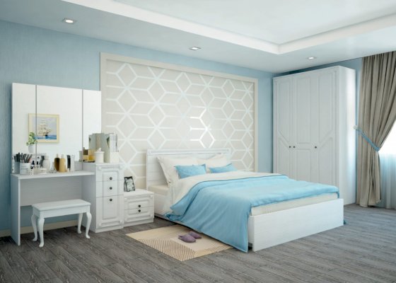 Спальня, выполненная в новом декоре ЛДСП и МДФ - Бодега белый, с использованием мягкого элемента «Белый Пунто», являет собой удивительное сочетание шикарного белого цвета и приятного тактильного ощущения. Высокие шкафы придают спальне несомненную практичность и функциональность, а интересная фрезеровка на фасадах - особый шарм классическому стилю.