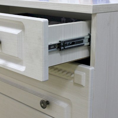 Фурнитура: ручки металлические со стразами, петли с доводчиками, в качестве опор (ножек) использованы пластмассовые подпятники. Шариковые направляющие.