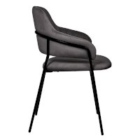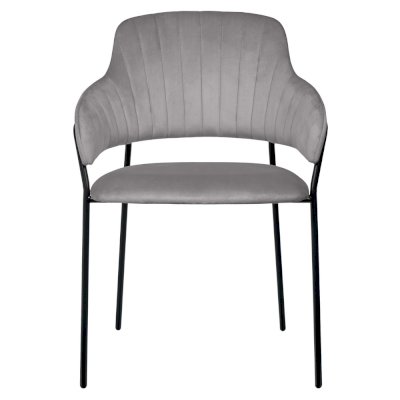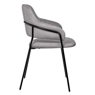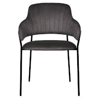 Каркас стула черного цвета изготовлен из прочного металла. Сидение обтянуто мебельным велюром, с приятной бархатистой структурой. Внутренняя сторона спинки украшена вертикальными строчками. Для комфорта есть высокие подлокотники.
