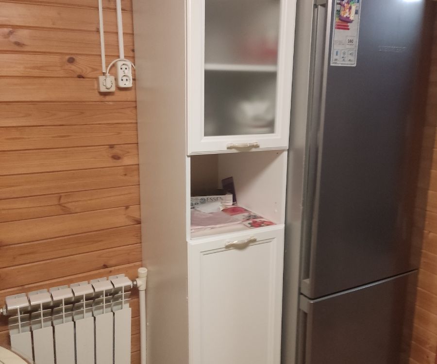 Отличный шкаф-пенал за свой бюджет. Комплектация - полная, включая конферматы , саморезы, гвозьди ,петли и тд . Доставка до двери (включая подъем на 5-ый этаж). По сборке без проблем собрал минут за 20. Единственное обклеил дверцу в черный глянец , чтоб более гармонично вписался на кухню.