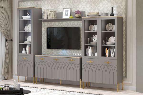 Большой комод - модное решение для современного интерьера. Мягкие серые оттенки «мокко» и «силк анис» сочетаются с золотым декором и яркой лицевой фурнитурой.