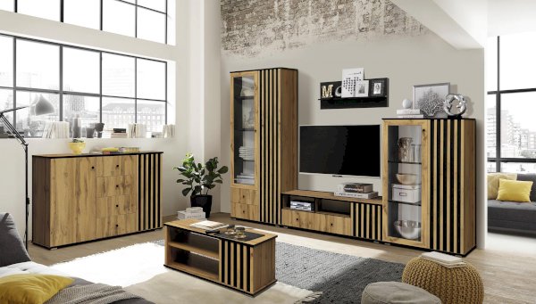 Торцы модуля - сверху, снизу и по периметру открытых полок покрыты черной пленкой и удачно гармонируют с реечным фасадом. Черные рамки подчеркивают границы тумбы. Таким образом достигается постоянный контраст, что выглядит очень эффектно!