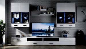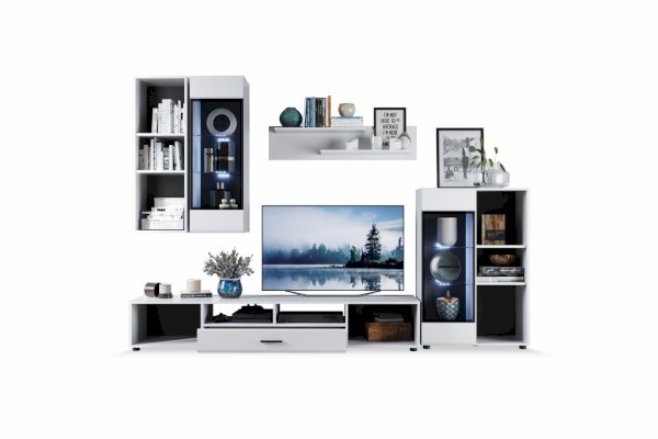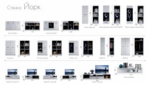 Модульная система Йорк выполнена в стиле минимализма. Строгие, лаконичные линии подчеркивают элегантность комплекта. Белый цвет мебели с деталями глубокого черного визуально сделает комнату светлее, просторнее и позволит составить безупречный по стилю комплект мебели. Сочетание глянцевой и стеклянной поверхностей, открытых полок создадут уютную обстановку и позволят украсить убранство комнаты приятными мелочами и разместить любимые книги и фото. Светодиодная подсветка придаст индивидуальность Вашей мебели. А широкая тумба для ТВ с выдвижными ящиками на телескопических направляющих позволит удобно разместить телевизор любой диагонали и другие медиаустройства Модульная система позволит подобрать по размеру вариант именно для Вашей комнаты, не оглядываясь на фиксированный размер, как в других стенках. Мебель выполнена из экологически безопасных материалов.