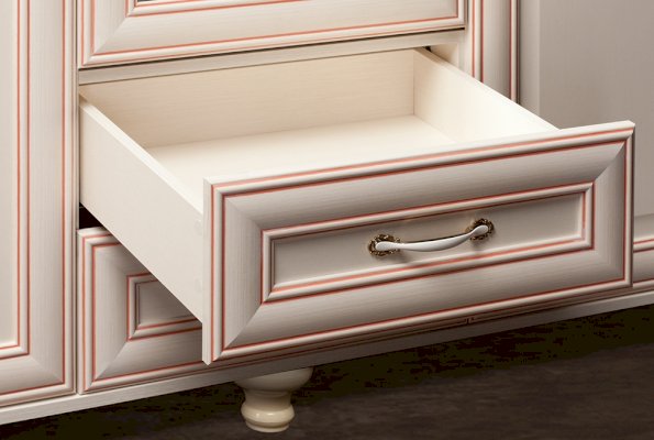 Фурнитура: ручки металлические под золото с белыми вставками под эмаль, ножки пластмассовые на металлической опоре, направляющие шариковые