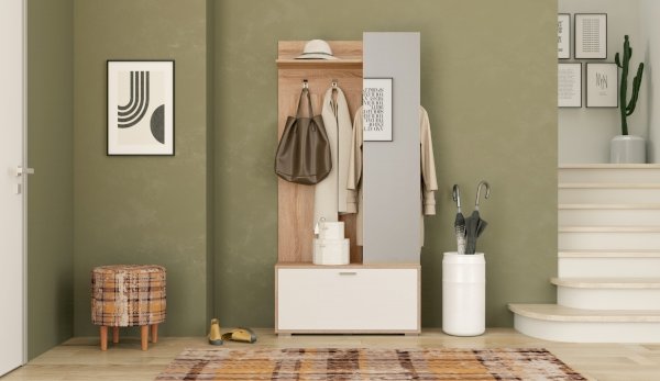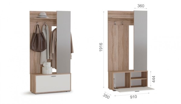 Прихожая Лайт компактна и вместительна, идеальное решение для помещений с маленькой площадью. В ней оптимальный набор модулей: вешалка с двумя крючками для верхней одежды и полкой для головных уборов, тумба для обуви с механизмом газлифт, который надежно фиксирует дверцу в открытом и закрытом положении. Скрытая за зеркальным полотном секция со штангой по вместимости заменяет небольшой шкаф. Зеркало не только служит декоративной ширмой, но и визуально расширяет пространство. Универсальный светлый дизайн в цветах дуба сономы и белого – верх элегантности и воздушности, который вписывается в прихожую любых размеров.