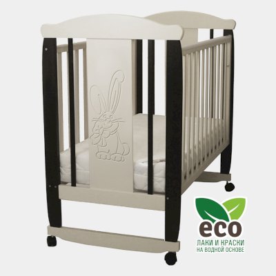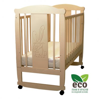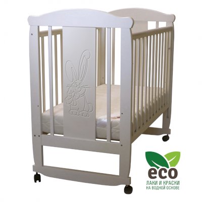 Кроватка декорирована фрезерным рисунком "Заяц с бантом". Уникальные фрезерные рисунки размером от 50 см на обеих спинках.