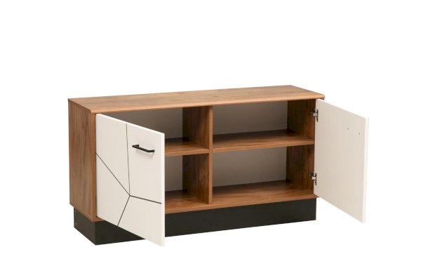 Компактная, но вместительная тумба под ТВ за двумя распашными дверцами скрывает два отсека, в каждом из которых находятся по две полки из ЛДСП. По высоте они разные – верхние чуть поменьше, нижние – побольше. На любой вкус и размер.